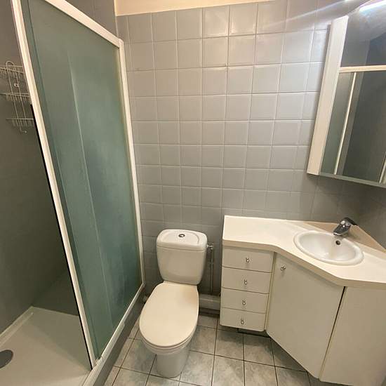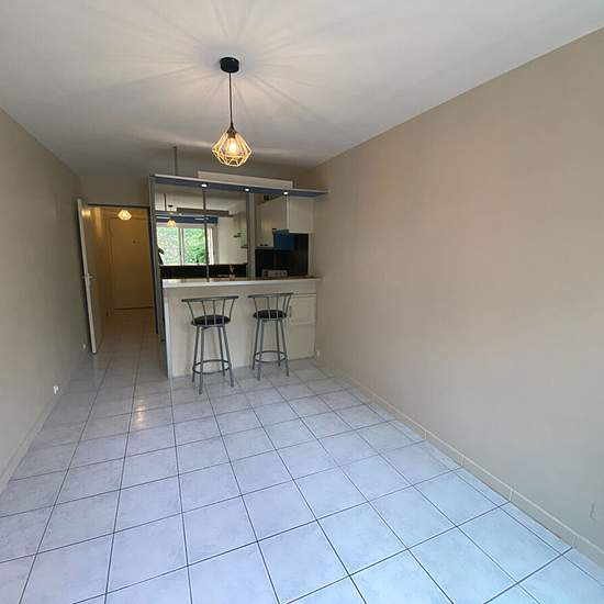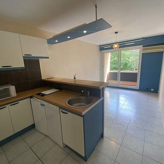 Dans résidence fermée appartement de type studio avec balcon plein sud, comprenant une entrée avec rangement, une pièce principale cuisine ouverte équipée séparée par un comptoir, salle d'eau avec wc, balcon.