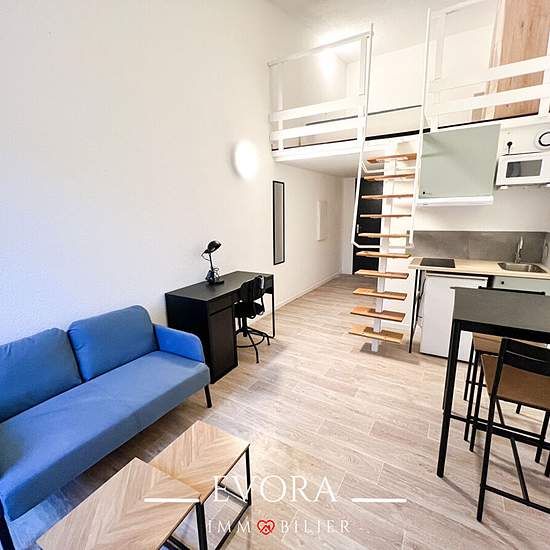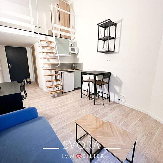 METZ CENTRE - STUDIO MEZZANINE Appartement meublé de 23.97 m² Carrez entièrement rénové, situé au troisième étage d'une résidence sécurisée à 550 mètres du pôle universitaire de Lorraine et 2 minutes du Lycée Louis de Cormontaigne. Il comprend une entrée, une kitchenette ouverte sur une charmante pièce de vie, un espace de rangement et une salle de douches à l'italienne avec wc. Un escalier donnant accès à un coin nuit en mezzanine. Chauffage individuel électrique. Disponible mi-janvier. Local vélo commun accessible. Surface : 23.97 m² carre...