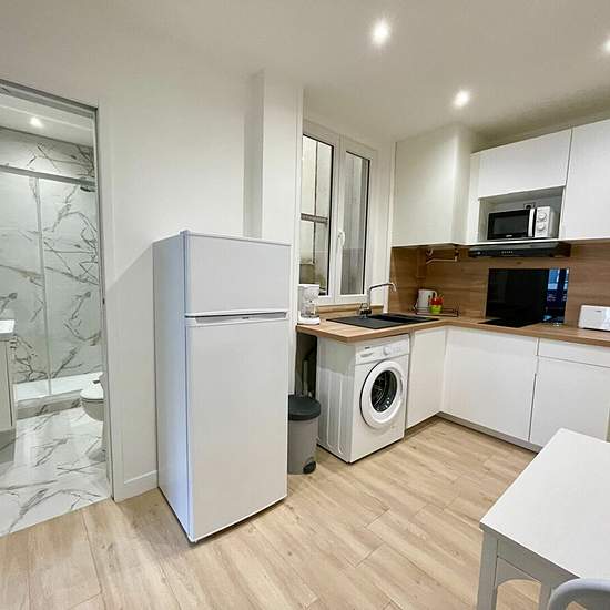 Studio location meuble - avenue aristide briand à montrouge. Studio entièrement rénové au 1er étage d'un immeuble ancien comprenant : une cuisine séparée aménagée et équipée avec table et chaises, réfrigérateur, micro-ondes, machine à laver, plaque, hotte, cafetière, grille pain), une salle d'eau avec wc, un séjour avec canapé lit (rapido) neuf, table basse, meuble télé, lampadaire, télé, dressing. Disponible de suite, contacter m gaïd .