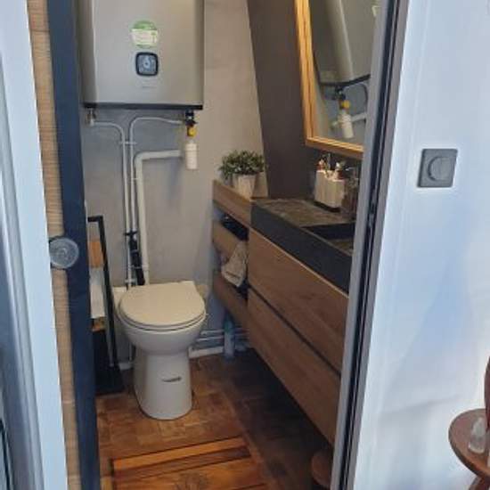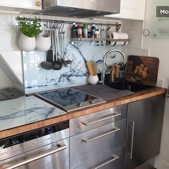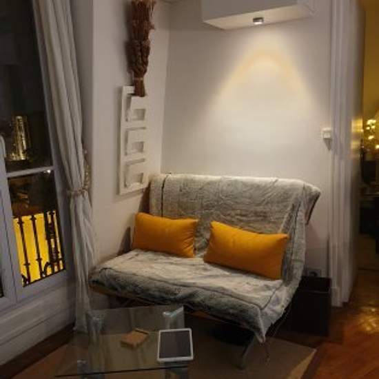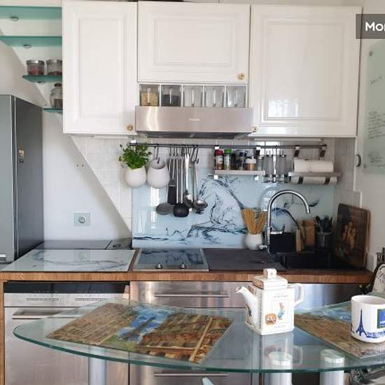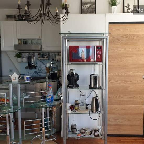 Furnished and decorated with care, "hotel" quality, plenty of storage space, fully equipped kitchen, fridge, Miele induction, dishwasher, washing machine, microwave oven, "Grohe aqua blue pure" drinking water filtering system, full equipment (espresso machine, toaster, kettle, steam cooker, etc.), full set of crockery and cutlery, television; Quality designer furniture in glass/steel (bed, glass bar and 3 bar chairs, wardrobe and overhead cupboards),. backlit wall for pleasant evening light. Sleeps up to 2 people (sofa bed), but one person e...