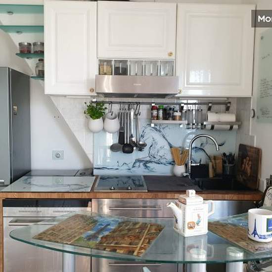 Furnished and decorated with care, top of the range services, "hotel" quality, numerous storage spaces, fully equipped kitchen, fridge, Miele induction, dishwasher, washing machine, oven, "Grohe aqua blue pure" water filtering system, complete equipment (espresso machine, toaster, kettle, steam cooker, etc.), full set of crockery, television in each room, including a "cinema" screen in the bedroom. Quality design furniture in glass/steel (bed, table 8 p/console, chairs, cupboards), many storage space, backlit wall Sleeps up to 4 people (doub...