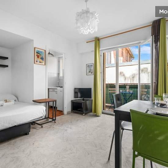 Discover this pleasant, well-equipped studio apartment on the second floor of a building in Nice. Enjoy the view over the inner courtyard from the small balcony equipped with a table and two chairs. With a surface area of 23 m², this studio comprises: - a lovely, light-filled living room with a 140x190 double bed and a dining area, - a separate, fully-equipped kitchen (coffee machine, toaster, kettle, microwave, hob, fridge), - bathroom with shower and WC, - hoover, hairdryer, iron, clothes hangers, - fan, radiators, central heating, - car...