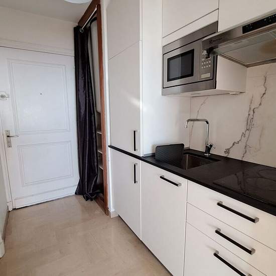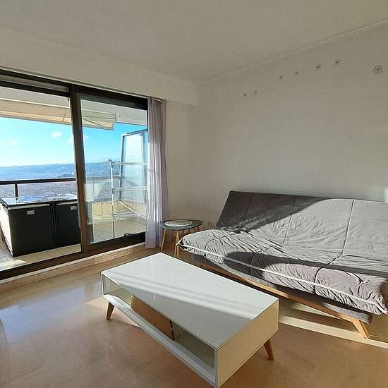 STUDIO MEUBLE MONT BORON. NICE MONT BORON: Situé dans une belle résidence de standing avec piscine et gardien beau studio meublé avec une grande terrasse, vue panoramique sur la colline du château et vue mer. Cave et garage. Disponible début janvier