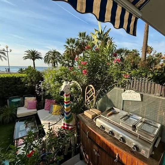 Nice Promenade / CUM, superbe appartement spacieux en front de mer avec jardin privatif, table et salon de jardin, large vue Mer et palmiers. Haut standing, idéal couple ou étudiants. Location annuelle 1650 Euros CC