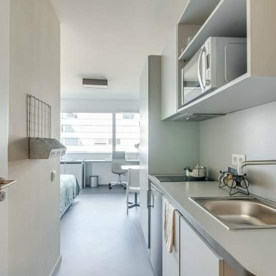 T1 fully furnished with a single bed 90x200cm and its storage drawers, a mobile bedside table or integrated to the headboard, a desk with a pedestal and armchair, a chest of drawers or a large closet, a dining table with a chair and many other storage items. The apartment is equipped with a wall light at the headboard, a desk lamp, a TV on wall bracket and a bed kit (pillow, comforter, mattress pad). The kitchenette is fully equipped with crockery, utensils and appliances including a kettle and toaster. The private bathroom includes a large ...
