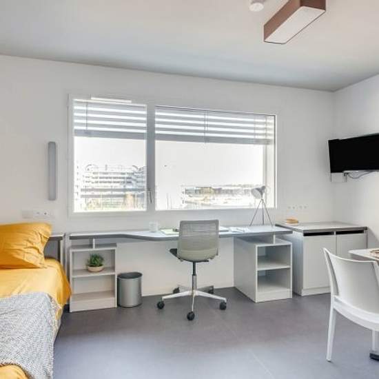T1 fully furnished with a single bed 90x200cm and its storage drawers, a mobile bedside table or integrated to the headboard, a desk with a pedestal and armchair, a chest of drawers or a large closet, a dining table with a chair and many other storage items. The apartment is equipped with a wall light at the headboard, a desk lamp, a TV on wall bracket and a bed kit (pillow, comforter, mattress pad). The kitchenette is fully equipped with crockery, utensils and appliances including a kettle and toaster. The private bathroom includes a large ...