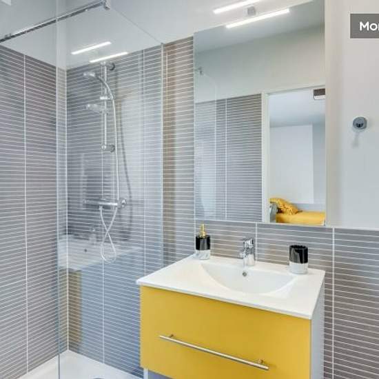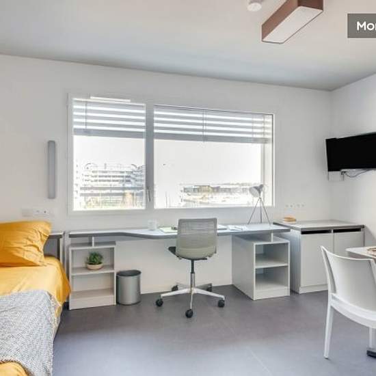 This accommodation is only available for rent for students. T1 fully furnished with a single bed 90x200cm and its storage drawers, a mobile bedside table or integrated to the headboard, a desk with a pedestal and armchair, a chest of drawers or a large closet, a dining table with a chair and many other storage items. The apartment is equipped with a wall light at the headboard, a desk lamp, a TV on wall bracket and a bed kit (pillow, comforter, mattress pad). The kitchenette is fully equipped with crockery, utensils and appliances including...
