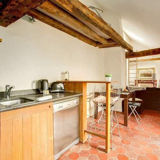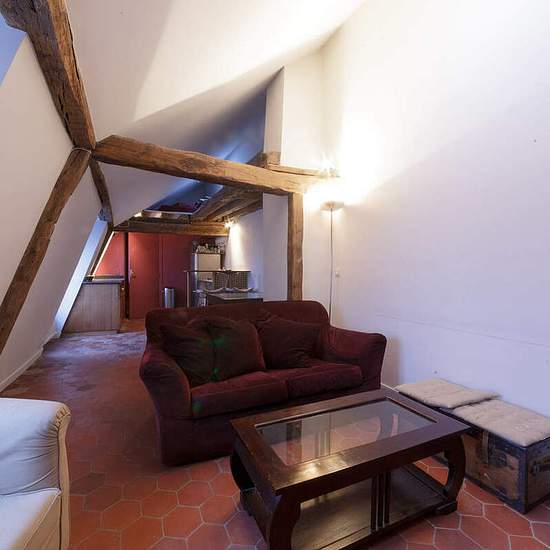 Original 1-bedroom apartment for rent on Rue Chapon in the 3rd administrative district of the French capital. This is a comfortable flat for a couple in the center of Paris - an excellent housing option as for short as long-term residence. Surface - 40 square meters; attractive interior; quality furniture and home appliances; 5th floor. Layout: a living room with a fireplace, an open kitchen, a bedroom with a bathtub, a toilet. Location The apartment is located in the central part of Paris near Le Marais area; not far from the Seine, Louv...