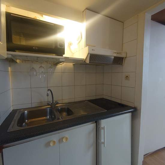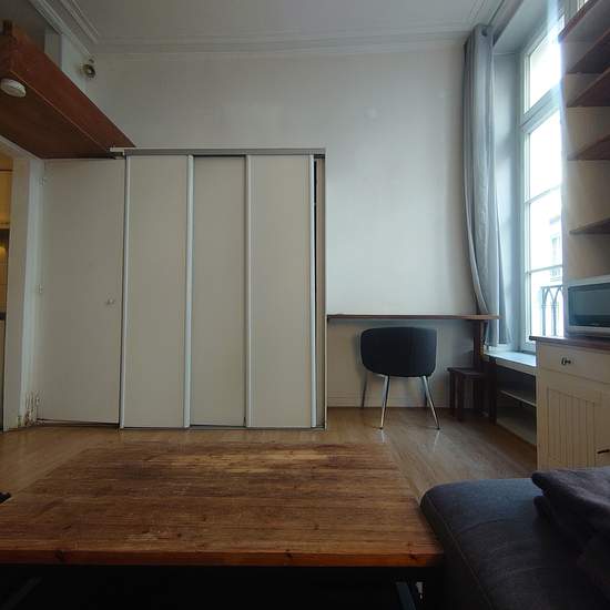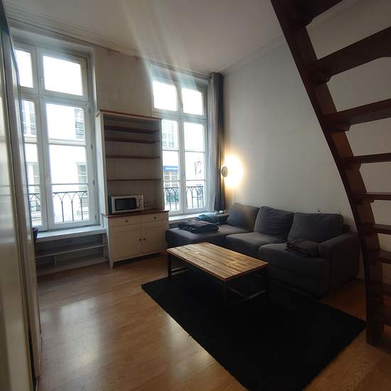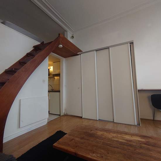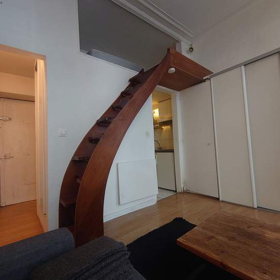 Latin Quarter, on the corner of Rue Mouffetard, in an old building on Rue Descartes, on the 1st floor a furnished studio of 18.42 m² of living space comprising: an entrance with wardrobe, a living area with a 4 m ceiling height and numerous storage spaces including an integrated wardrobe, a desk area, a semi-open equipped kitchen (microwave, electric hob, extractor hood, refrigerator), a mezzanine with sleeping area and ceiling height sufficient for a seated position, double glazing. Individual electric heating and hot water. Rent including ...