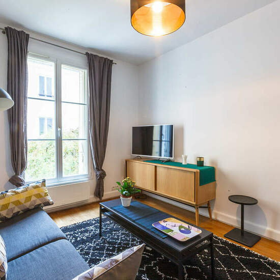 Light furnished 1-bedroom apartment for long-term rent on Rue Augereau in the 7th arrondissement of Paris. Cozy flat for a couple in a very good quarter of the French capital near Champs de Mars. Surface - 33 square meters; 1st French floor of a modern building. The apartment’s layout: a living room with a sofa, a table, chairs, TV; a bedroom with a double bed and a wardrobe; an equipped kitchen; a bathroom; a small entrance hall. The apartment is located in a convenient area in Paris near Champs de Mars, Eiffel Tower, the Seine, Trocade...