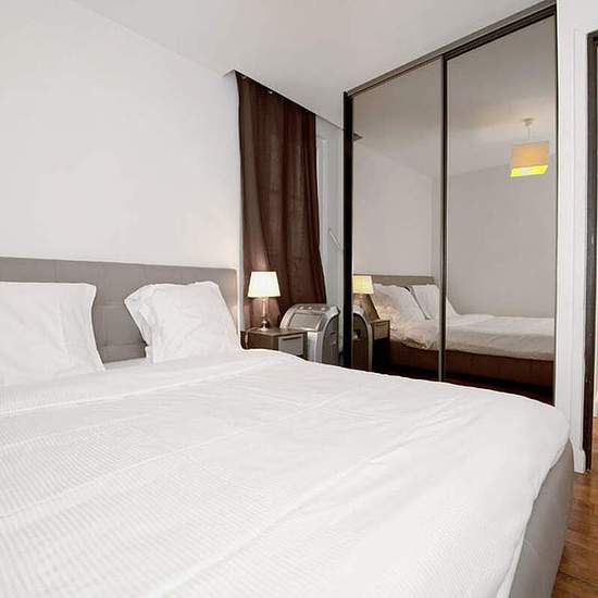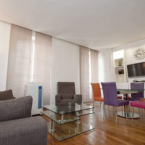 Stylish light 1-bedroom apartment for rent on Rue de Ponthieu in the 8th arrondissement of Paris. Furnished flat with an original interior, it is a very good residential option for a couple. Surface - 57 square meters; the 1st French floor of a 19th century building with a courtyard; capacity - 2 persons. Minimum rental period - 1 month. The apartment's layout: a living / dining room with a sofa, an armchair, a dining table for six persons, TV, a coffee table; a bedroom (a double bed, a wardrobe with mirrored doors, a glass table); a fully...