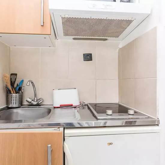 A sunny studio apartment is available to rent in Paris's 11th arrondissement. The apartment has a charming main room, where you'll find a cozy single bed, a desk, and lots of storage space for all your things. The kitchenette has all the basics, including a 2-burner stove and a microwave. The bathroom is modern, with a sizable shower and a heated towel rack. Toasty! You'll be living in the 11th arrondissement, 1 of Paris's most central and well-connected districts. Around the area, you'll find lots of restaurants, cafes, bakeries, small park...