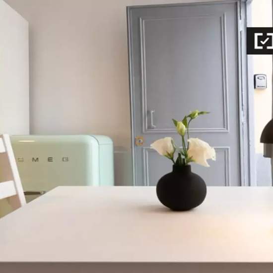 Furnished studio apartment for rent on Rue Saint-Maur. The property is on the ground floor. Important: A basement (7 m²) is also available for rent (optional) in the same building for €40/month. The amount of the electricity bill may vary by season (between €50 and €120). The bill is provided to the tenant by the landlord. Welcome to our cozy and recently renovated studio in a charming building. It's a lovely furnished studio in Scandinavian style (we are Swedish) on the ground floor. Although small, the garden just outside your doorstep m...