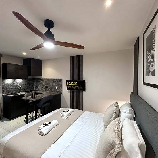 EN Are you dreaming of a romantic or adventurous getaway in the city of love? Look no further than our elegantly decorated studio located in the heart of Paris. Immerse yourself in the authentic Parisian lifestyle in this prime location, where style meets comfort. This studio is designed for you for optimal comfort! The Space: Luxury Sleep: Indulge in a sumptuous queen-size bed (160x200) adorned with impeccable sheets, plush blankets, and soft pillows. Modern Bathroom: Freshen up in an elegant bathroom equipped with a spacious shower. No nee...