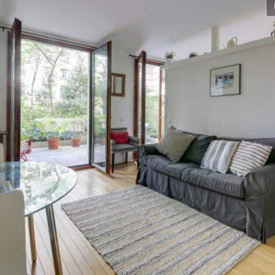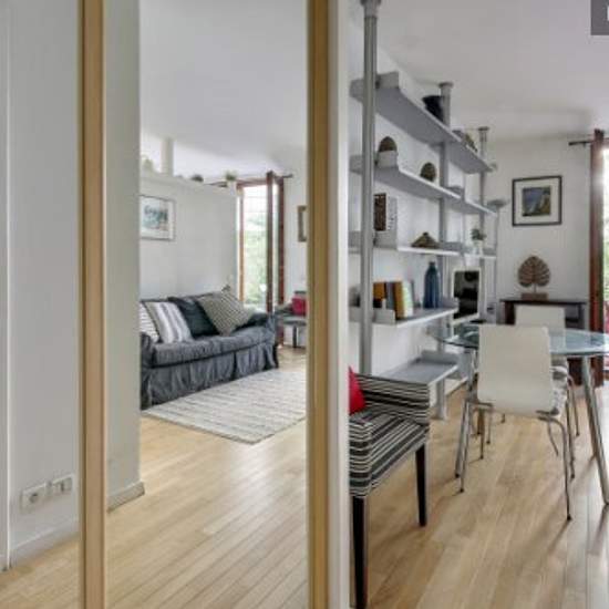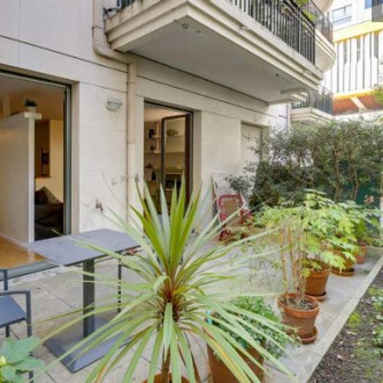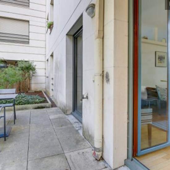 Spacieux studio alcôve de 38 m2 à louer au mois. Idéal pour 1 ou 2 personnes avec une grande terrasse. Au rez-de-chaussée d'un immeuble récent rue Emeriau. Dans le quartier de Beaugrenelle, Paris 15ème arrondissement