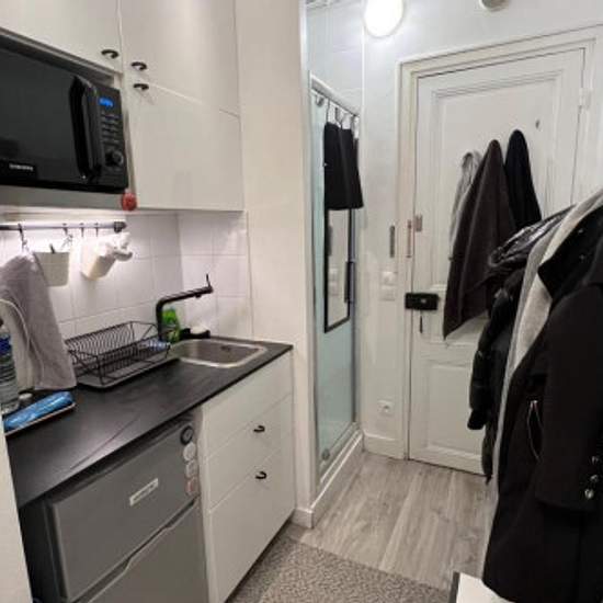 Appartement Studio – 12 m², lumineux et calme, en excellent état. Ce bien se compose d'une pièce principale aménagée avec télévision et banquette-lit, d'une kitchenette équipée, ainsi que d'une salle de bain. WC semi-privatif sur le palier. L'appartement dispose également d'un lave-linge, de parquet au sol et de rangements intégrés. Chauffage et eau chaude collectifs inclus. Situé au 6ème étage d'un immeuble de style Haussmannien sans ascenseur. Sécurisé par digicode et interphone. Ne manquez pas cette opportunité rare !
