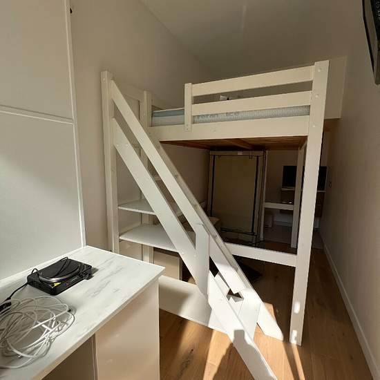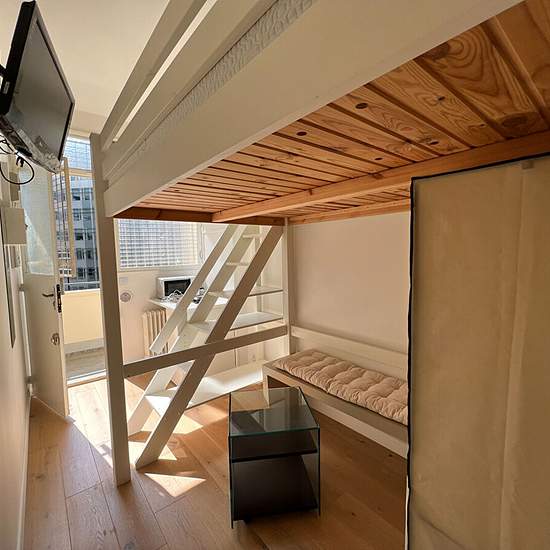 On the 3rd floor of a high-end building, furnished small studio for rent with a kitchenette area including refrigerator, microwave and cooktop, and a mezzanine bed (single bedding 190 x 120 cm), shower room. Secure upscale building, pleasant surroundings, caretaker, entry code, elevator. Fiber-optic outlet. Impeccable toilet on the landing opposite. Rent €795/month, all charges included at a flat rate (water and heating). Security deposit required. Available immediately. Energy rating: D.