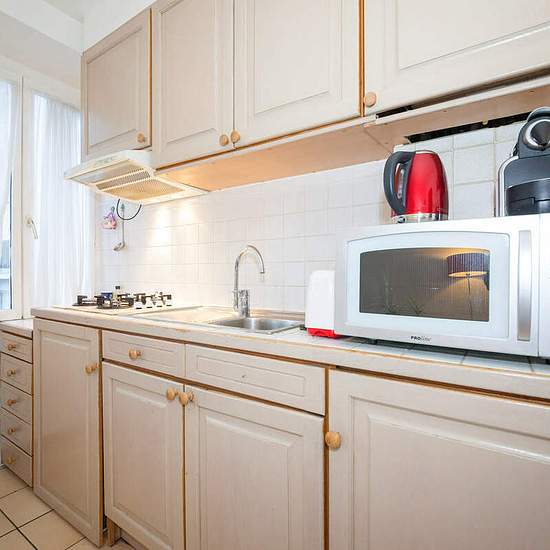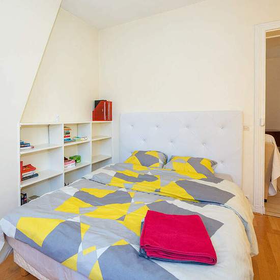 A small but very cozy one-bedroom apartment on rue de la Tour (16th arrondissement of Paris). The apartment is located on the fifth floor of a building without an elevator with the entrance codes. Flat’s space is 35 square meters. The maximum number of occupants is 4 persons. Living room is combined with kitchen. The room has a large sofa with cushions, coffee table, TV, table and chairs, stove, microwave, kettle, coffee maker, food processor, cupboards, crockery and cutlery. The bedroom is made in bright colors. It has a double bed, wardr...