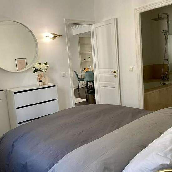 Nice furnished 1-bedroom apartment for long-term rent in the 16th district of Paris on Rue Greuze. It is a good accommodation option in a prestigious area of the French capital for a couple or a family with a child. The area of the apartment is 60 square meters; 3rd French floor of the building with elevator; number of tenants - up to 3 persons; minimum rental period - 1 month. Layout: living room with a sofa, a dining table, armchairs, a coffee table, shelves, a cupboard; equipped kitchen; bedroom with a double bed, a dresser, a mirror; b...