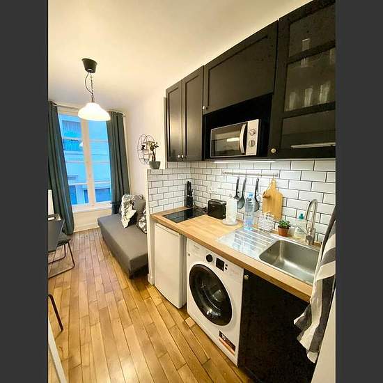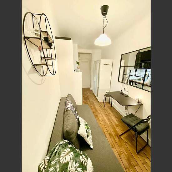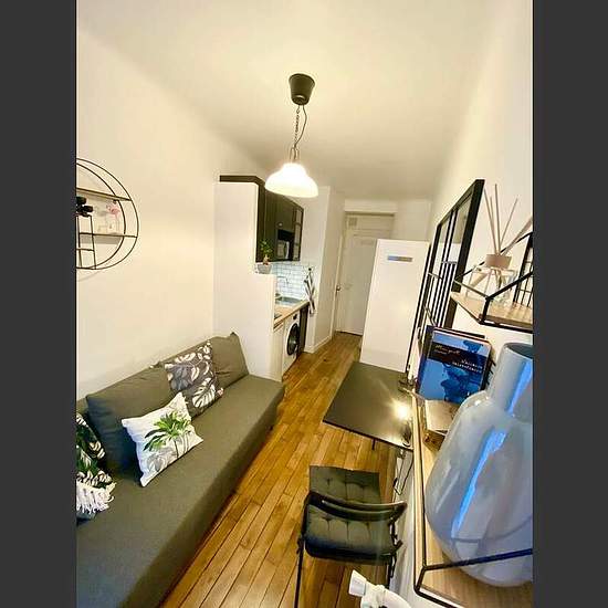 We offer you a compact 1-room apartment for long-term rent in a very nice area of Paris. It is a small, but quite nice and functional studio for one person. Pleasant interior; surface - 14 square meters; 1st French floor; natural wood floor. Living room with a large window has a sofa, a small table, a chair, a wardrobe. Open kitchen space. Bathroom with a shower, a washbasin and a toilet. If we talk about location, we have to admit that it is an important advantage of this apartment. It is a few minutes walk to the Seine quay, a short wal...