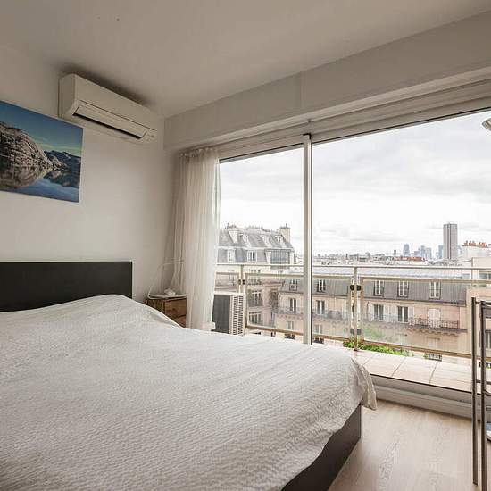 Furnished 1-bedroom apartment for rent at Avenue de Wagram in the 8th district of Paris. It is a cozy residence, located in a great neighborhood of the French capital, which could be an ideal long term housing option for a couple. Surface - 50 square meters; light interior; great furnishing; 7th floor of an apartment building; an open balcony; beautiful views of the city. Minimum rental period is one month; number of tenants up to four persons. Layout: living room with a sofa bed, TV, armchair, a coffee table, a closet; dining area, bedro...