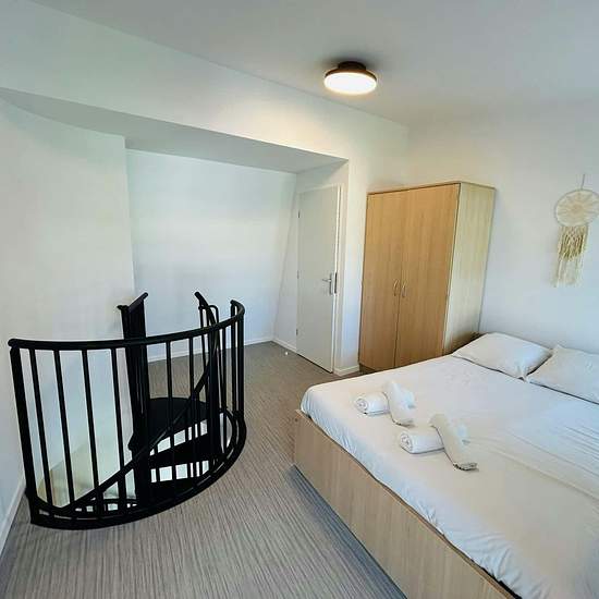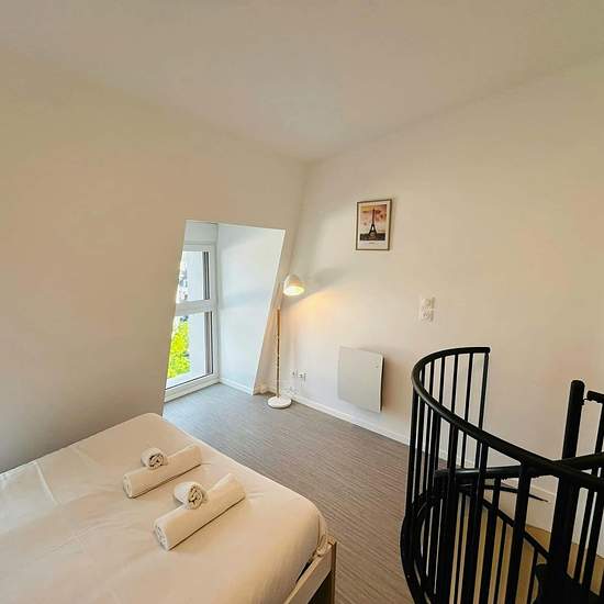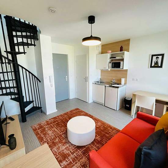 [EN] We offer a charming, brand new, two-room duplex apartment, ideally located for a short or long stay, just steps from Reims Cathedral! Located in a new building, this fully furnished apartment has everything you need to feel at home. Weekly or monthly rental options are available depending on your needs. It comprises a living area with a kitchenette and living space, a separate bedroom, and a shower room upstairs. - Bright living area - Top floor with views of the city of Reims - Separate bedroom upstairs - Internet and television - Bran...