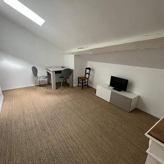 T1 meublé composé d'une cuisine indépendante avec éléments bas, des étagères encastrées, des cases de rangements avec plan de travail, un four micro-onde, une hotte, un réfrigérateur, une plaque vitrocéramique. Le séjour mansardé comporte d'une part un espace salon avec un canapé, une meuble TV + télévision, une table à manger avec quatre chaises, un buffet séparant la partie nuit composé d'un lit avec sommier, d'une table de nuit et d'une penderie ouverte avec étagères. La salle d'eau comprend une cabine de douche, un lavabo sur plan de tra...