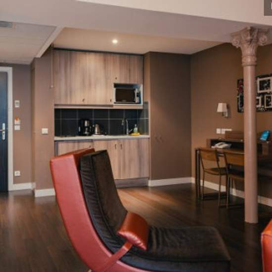 Le studio double de 25m², climatisé, pour 1 personne, se compose d'un espace de vie avec un lit double, d'une salle de bain et d'une TV LCD. La cuisine dispose d'un micro-onde, d'un réfrigérateur, de plaques vitrocéramiques. La vaisselle est également fournie. Sanitaires : baignoire ou douche adaptée aux personnes à mobilité réduite sur demande. Couchage : Lit double ou lit twin suivant disponibilité. Accès Wi-Fi gratuit dans tous les appartements. Un ménage hebdomadaire compris dans les charges. Supplément de 40 €/ par personne et / nuit, p...