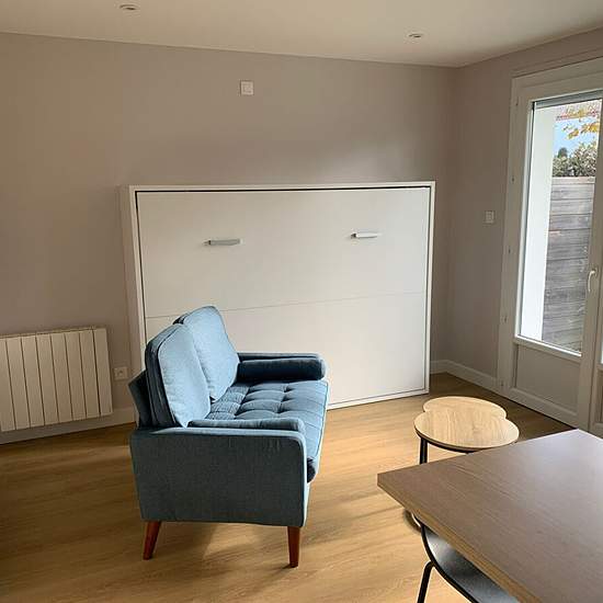 Confortable studio meublé entierement rénové idéalement située proche du centre Une entrée avec une pièce de vie (petit canapé ,table basse et dressing) avec un coin cuisine aménagée et équipée (mini-réfrigérateur, plaques de cuisson à induction, micro-onde, hotte), un espace repas, un lit double 140 relevable dans un coffre et une télévision, une salle d'eau avec un meuble vasque, douche cabine et WC, un cellier independant avec rangement et ballon d'eau chaude, une terrasse fermée et une place de parking privée. Bien en copropriété. Dépôt ...