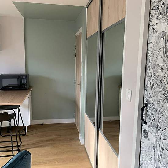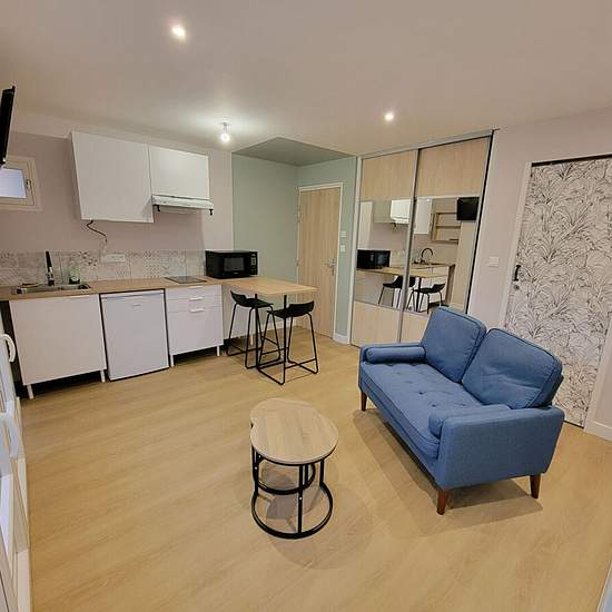Confortable studio meublé entierement rénové idéalement située proche du centre Une entrée avec une pièce de vie (petit canapé ,table basse et dressing) avec un coin cuisine aménagée et équipée (mini-réfrigérateur, plaques de cuisson à induction, micro-onde, hotte), un espace repas, un lit double 140 relevable dans un coffre et une télévision, une salle d'eau avec un meuble vasque, douche cabine et WC, un cellier independant avec rangement et ballon d'eau chaude, une terrasse fermée et une place de parking privée. Bien en copropriété. Dépôt ...