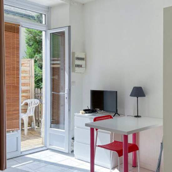 Situé en hyper centre à 8 min à pied de la gare et à 7 min de la place Jean Jaures, acces direct a toutes les lignes de bus et de tramway desservant l'ensemble de Tours et Saint Pierre des corps, loue studio avec terrasse privée sur cour au calme. Il comprend : - une cuisine équipée avec plaque de cuisson, frigidaire, plan de travail et rangement. - un espace de vie avec canapé lit, penderie et bureau et télévision écran plat - une salle d'eau avec douche. - une terrasse. Charges : 45 € Les charges comprennent : l'eau, l'entretien de l'immeu...