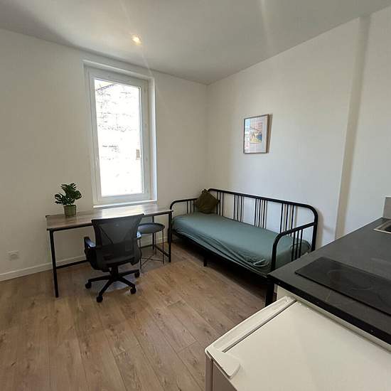Rue du Marechal Gallieni, proche écoles et secteur briffaut, studio meublé au premier étage entièrement rénové d'une superficie de 13.71m² composé d'une pièce à vivre avec cuisine équipée, (plaque, frigo), une salle d'eau et toilette. Disponible début décembre 2025. Eau et électricité individuel. Dans les charges vous avez l'internet
