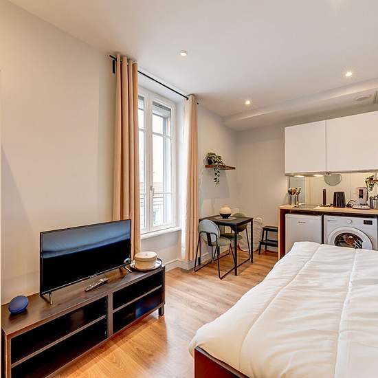 Studio Premium d'environ 16m2 entièrement rénové et meublé en 2025, dans une copropriété sécurisée. L'appartement est composé d'une pièce a vivre composée d'une cuisine et d'un espace nuit, une salle d'eau avec WC. L'appartement est loué entièrement meublé (frigo congélateur), lave-linge, plaque de cuisson, micro-onde, TV). Loyer : 630 euros Charges : 30 euros Dépôt de garantie : 1260 euros Frais d'agence : 210 euros (dont 3 euros/m2 pour l'état des lieux) DPE D Estimation des coûts annuels : entre 450 euros et 650 euros par an Zone soumise ...