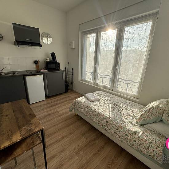 L'agence immobilière LABEL-IMMO située sur Valenciennes propose à la location un studio meublé à l'étage sur la commune de Raismes . Ce studio parfaitement bien meublé est idéal pour les étudiants ou jeunes actifs : vous êtes à 20 minutes en voiture de Valenciennes et à proximité des axes autoroutiers. Vous pouvez stationner votre voiture dans la rue gratuitement. D'une superficie de 12.20m2 à l'étage, il se compose d'une pièce de vie/nuit avec TV, lit 1 personne, table et chaise, d'un coin cuisine meublée et équipée (réfrigérateur, micro-on...