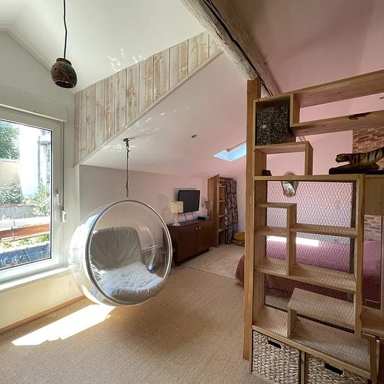 Maison atypique située au centre-ville de NANCY, au calme absolu et sans vis-à-vis, en deuxième corps de bâtiment avec JARDIN PRIVATIF. Elle se compose, au rez-de-chaussée : une entrée, une cuisine équipée ouverte sur séjour. A l'étage : une chambre, un espace bureau, une salle d'eau avec douche italienne. Le jardin comprend une terrasse, une pergola et un abri de jardin. Toiture et murs isolés. retrouver-nous sur
