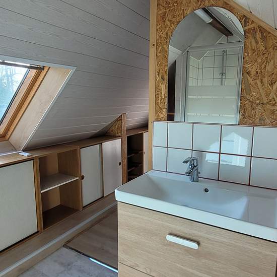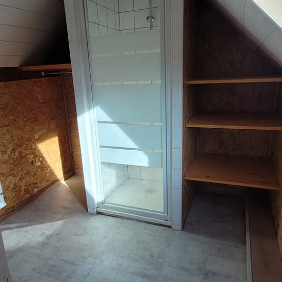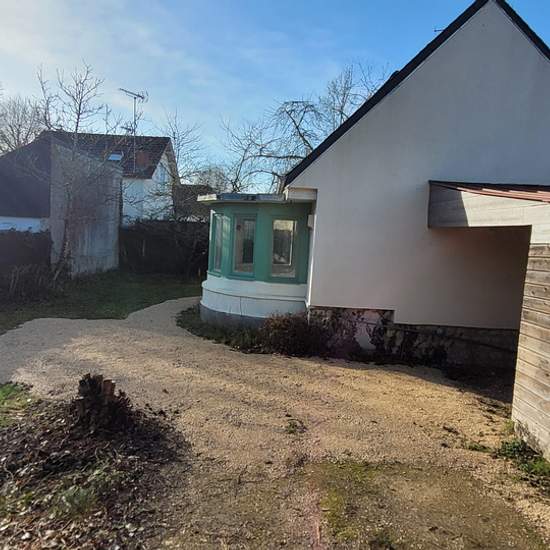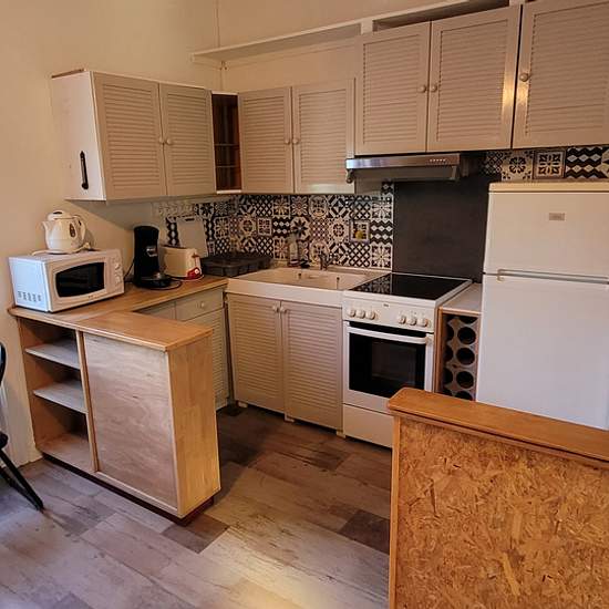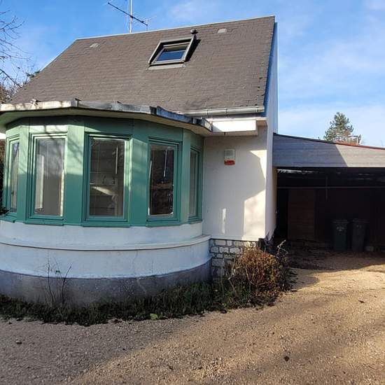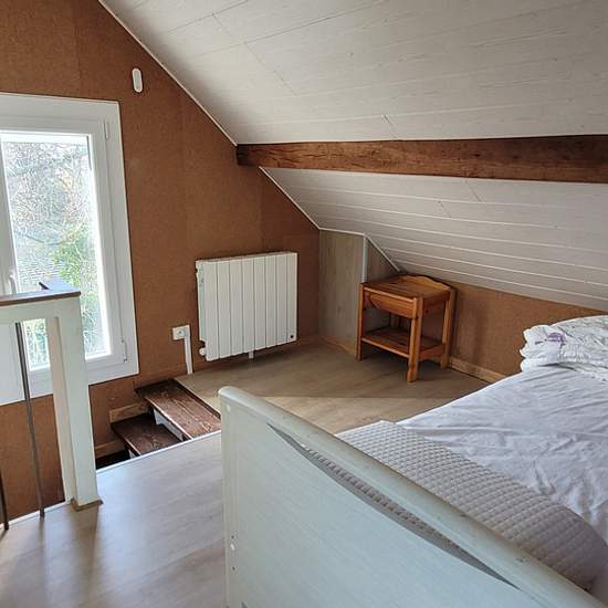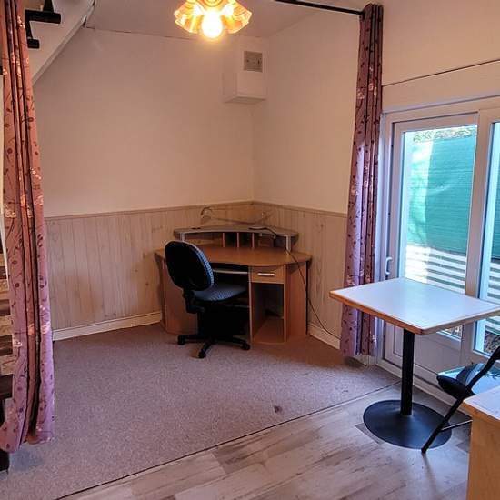 Atypical small furnished two-room house (40 m2 floor area / 28 m2 living area) on a 300 m2 garden. Ground floor: living room with kitchenette - loggia - toilet. Upstairs: attic bedroom. Lean-to. Close to tram and large supermarket.