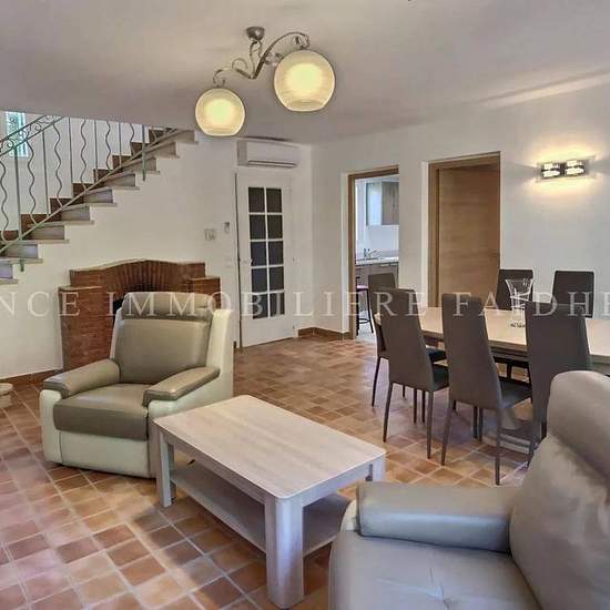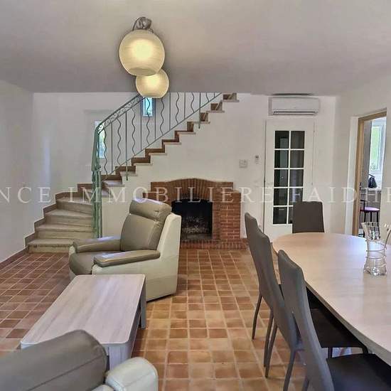 766AK REF 70 Charmante maison sur deux étages avec grand jardin située en face de la plage des Canoubiers se composant de : Au rez-de-chaussée : Une cuisine équipée Un salon avec salle à manger Une chambre avec lit en 90 et salle de douche Toilette Une grande terrasse À l’étage : Deux chambres avec grand lits Une chambre avec deux lits simples Une salle de douche avec toilette Une grande terrasse avec vue sur la mer Charges : linge, ménage, taxe de séjour (6,91€/jour/personne)