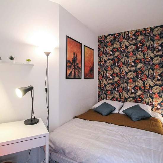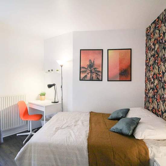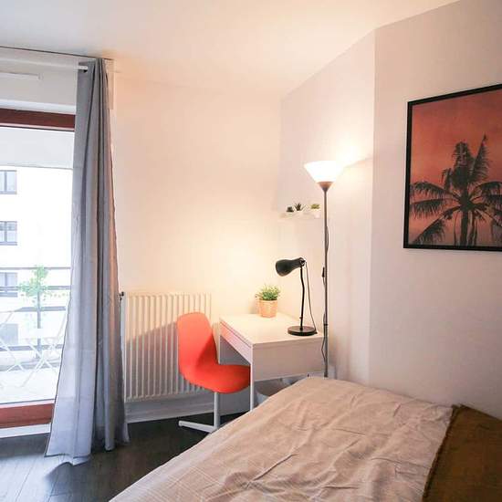 [FR] Chambre de 10m², entièrement meublée. Elle dispose d’un lit double (140x190) accompagné d'une table de chevet avec lampe. Un espace de travail est disponible, composé d'un bureau avec chaise et lampe. La chambre propose également plusieurs rangements : une armoire avec penderie et une étagère. L'atout de cette chambre est l'accès au balcon. Situé dans le quartier Les Martinets cet appartement de 90m² bénéficie d’un emplacement idéal, à deux pas du Parc des Impressionnistes et de la station de RER et à proximité de toutes les commodités....