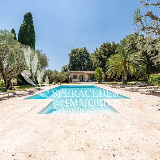 Proche des villages de Spéracèdes et Cabris, nichée au cœur d'un petit domaine privé et sécurisé, cette superbe propriété de caractère, anciennement résidence de l'écrivain Henri Troyat, s'étend sur un magnifique parc paysager de 5 000 m². Elle se compose d'une bastide en pierre rénovée de 250 m², véritable havre de charme, ainsi que de deux dépendances indépendantes de 50 m² chacune, idéales pour recevoir en toute intimité. La bastide offre au rez-de-chaussée des espaces de vie chaleureux et généreux : un hall d'entrée, un triple salon avec...