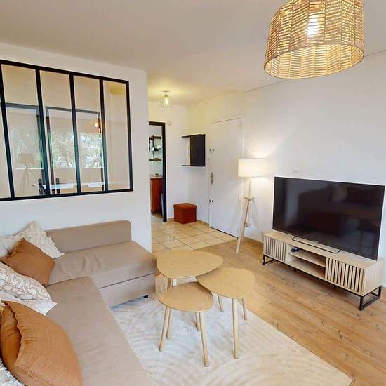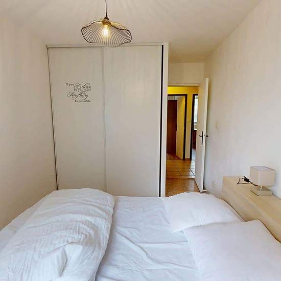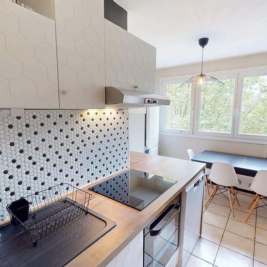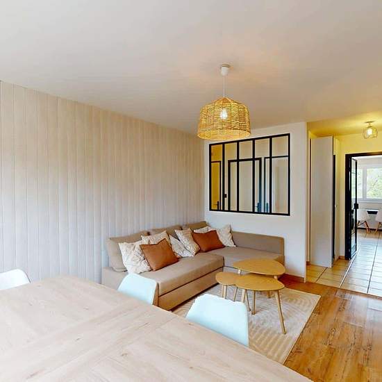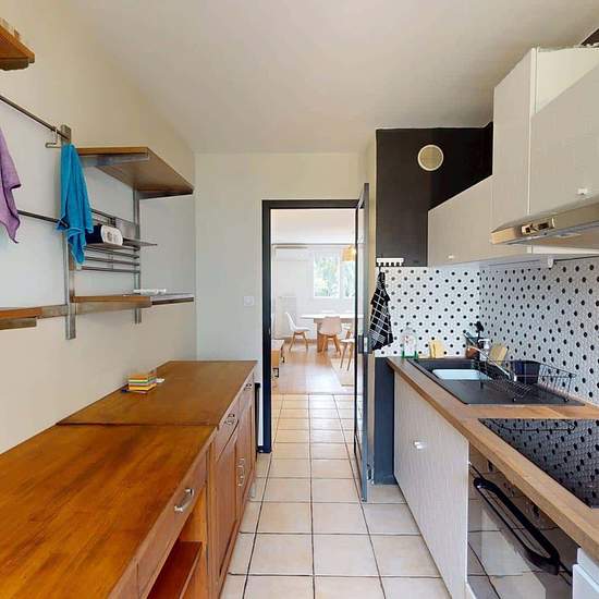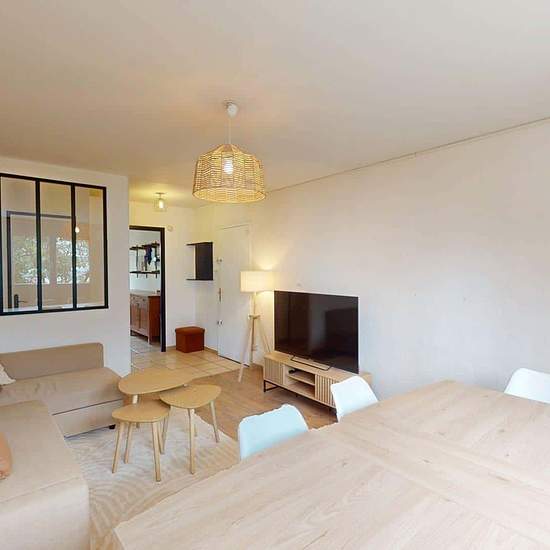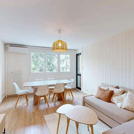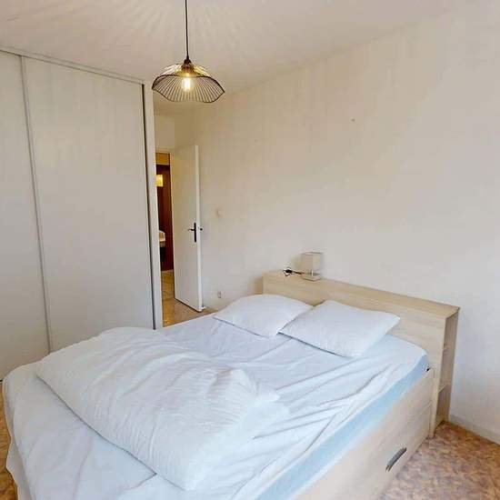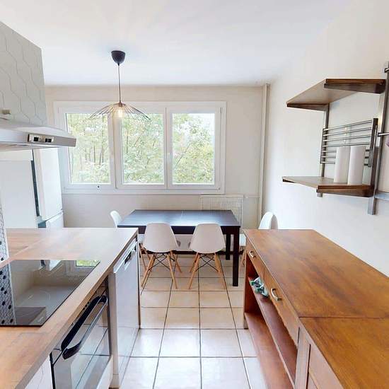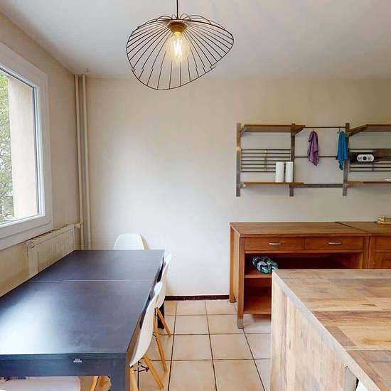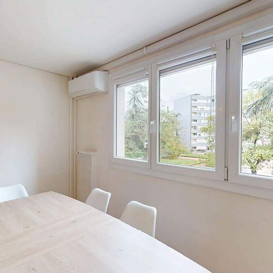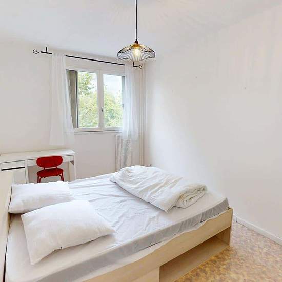 Oqoro offers this pleasant 4-bedroom shared apartment located on the 2nd floor of a quiet building with an elevator and a bike storage room. The 94 m² accommodation is located at 6 Place Beaumarchais, Échirolles. The common areas The apartment, which is through-facing and bright, offers a warm and functional environment. Living room: large L-shaped sofa, coffee table, TV unit with television, dining table. Bonus: it opens onto a loggia, ideal for enjoying the outdoors. Separate fully equipped kitchen: oven, microwave, hob, extractor hood, si...