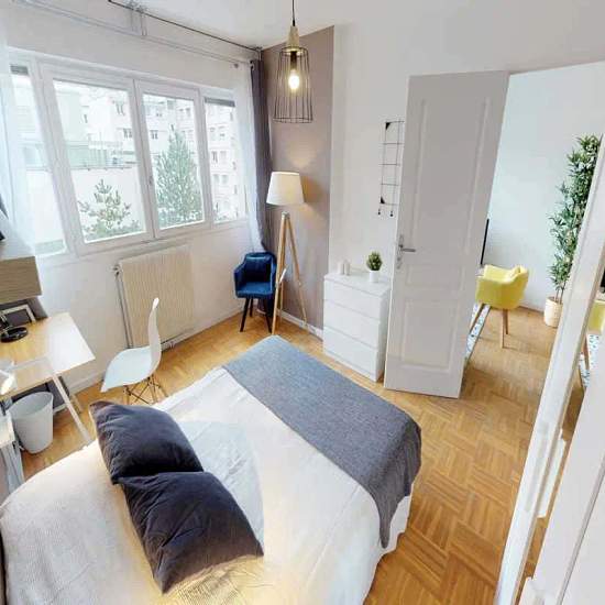 EN This lovely private bedroom in a fully equipped, furnished and all-inclusive flatshare in Lyon is a mix of comfort and design. It has got household furnishings, including a bed with pillows and duvet What is missing is your things to feel at home! The room can be locked if you need intimacy. The flatshare can be found in the Foch neighborhood, in the heart of Lyon. Plenty of shops, public transports, restaurants are accessible close by. The apartment is on floor 3 with lift. It is entirely equipped and is composed of a large kitchen with ...