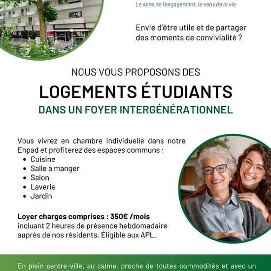 Bonjour, il reste des LOGEMENTS ÉTUDIANTS INTERGÉNÉRATIONNELS à TOURS dans notre maison de retraite associative pour 350€/mois Charges comprises. En centre-ville de Tours, à proximité directe des transports en commun (tram, bus) et des commodités. La Résidence associative Georges Courteline (EHPAD) propose des chambres individuelles à des étudiants et étudiantes & Accès à de nombreux espaces communs : Cuisine partagée Salle à manger Salon Laverie Jardin Loyer : 350€/mois, charges comprises Éligible aux APL En échange : 2h de pré...