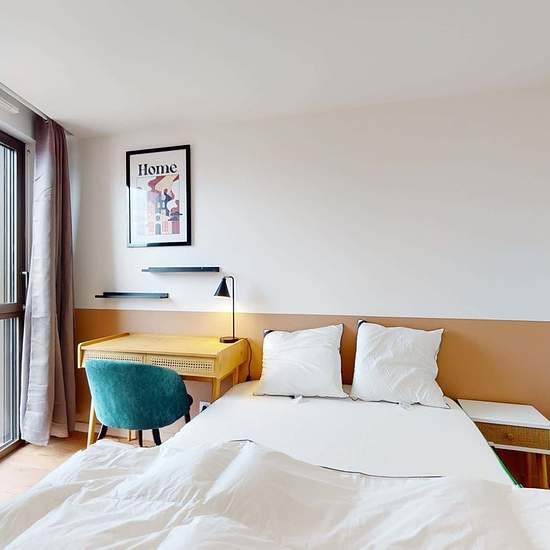 This spacious and comfortable room has been designed for you dear roomie! Practical and functional, the room is equipped with high quality bedding (140x200cm), a beautifull wardrobe, a night table and a true office space for your exams or your home office days! All of this in a cheerful and warm atmosphere. In addition, you have access to a shared bathroom and a shared terrace. Beautiful flatshare in Bordeaux ! Discover Bordeaux Brulatour, our cosy and freshly renovated contemporary-style apartment. Close to local shops and restaurants, ...