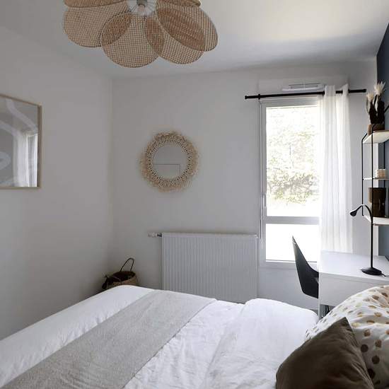 Décorée dans des teintes de gris sable et de bleu gris servant aussi à délimiter les espaces, elle comprend deux espaces : un espace nuit et un espace de travail ainsi qu’un grand placard intégré pour y entreposer vos affaires. Nous prenons une provision sur charges pour l’eau, le chauffage et l’électricité. L'assurance habitation et internet sont, quant à eux, compris intégralement dans le montant total de votre loyer. Comme toutes les chambres de cet appartement, cette chambre est éligible aux APL selon les conditions de la CAF. Ce vaste a...