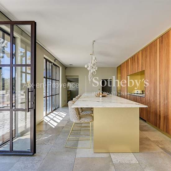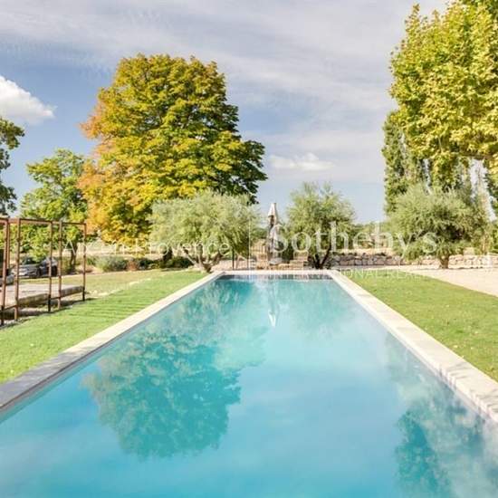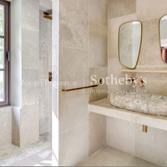 Bastide du XIXe siècle rénovée, à louer au nord à 10 min d'Aix-en-Provence (COUTERON), offrant environ 450m² de surface habitable. La propriété comprend une piscine de 15x3,5 mètres avec une vue exceptionnelle sur la Sainte Victoire, nichée au cœur d'un parc arboré de 8000m2 agrémenté de platanes centenaires, d'oliviers et d'une fontaine. Rez-de-chaussée : galerie d'entrée, salon avec cheminée, séjour, salle à manger, cuisine américaine équipée avec accès de plain-pied à une grande terrasse. Un cellier et une cave à vins. Deux suites avec sa...