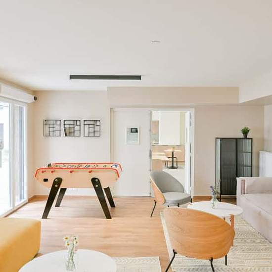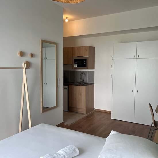 *These pictures are orientative, some variations are possible. This room is situated on the ground floor of a 3-story residence, which features a total of 5 rooms. Conveniently, the shared spaces, including the kitchen and living room, are located on the ground floor level. This room has a private kitchen in the bedroom on top of the shared one of the house. 140 cm bed • Ensuite bathroom • Shared kitchen Shared balcony/terrace 5 rooms in the appartment • Street window view EXTRA-SERVICES - Add Bedlinen and towels, changed weekly (not include...