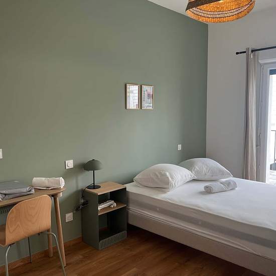 *These pictures are orientative, some variations are possible. This room is situated on the ground floor of a 3-story residence, which features a total of 5 rooms. Conveniently, the shared spaces, including the kitchen and living room, are located on the ground floor level. This room has a private kitchen in the bedroom on top of the shared one of the house. 140 cm bed • Ensuite bathroom • Shared kitchen Shared balcony/terrace 5 rooms in the appartment • Street window view EXTRA-SERVICES - Add Bedlinen and towels, changed weekly (not include...