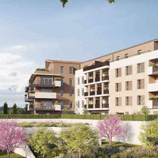 Aix-la-Duranne — Résidence Vela Bianca, located in a new development (delivery December 2025). Type 2 (one-bedroom) apartment of 43.85 m² on an elevated ground floor, comprising a large living room with fitted open kitchen, one bedroom, a shower room and WC, a nice terrace of 22 m², and an underground parking space. Available December 10, 2025. Rent: €950; charges: €80; security deposit: €950; agency fees: €570.