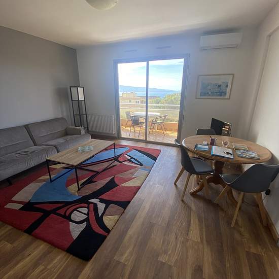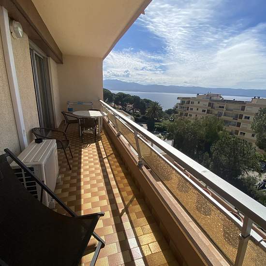 Location d'un 2 pièces meublé, situé début route des Sanguinaires, d'une surface de 47m2, au 1er étage avec ascenseur, parking au pied de l'immeuble. Comprenant une entrée sur hall avec placards de rangement, accès salle de bain (baignoire) et sanitaire, 1 chambre avec lit en 140 et rangements muraux, une cuisine entièrement équipée ouverte sur un séjour avec de grandes baies vitrées vue mer, et terrasse de 15m2. Libre à compter du 15/12/2025 Climatisation. A proximité du Trottel, et des plages.