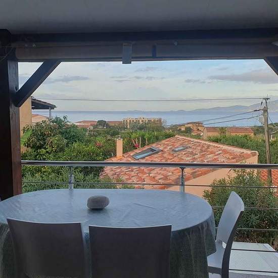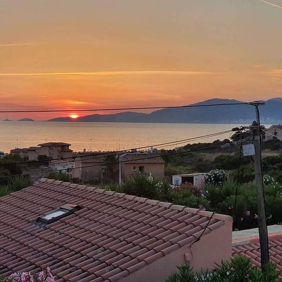 Situé sur le lieu dit du Molini d'Agosta appartement pour 4 personnes. Vous apprécierez la vue sur la baie d Ajaccio ainsi que son magnifique coucher de soleil sur les îles sanguinaires grâce à sa terrasse de 10m² . Situé à 5 minutes à pied de la plage d'Agosta et des commerces de proximité. Localisé au premier étage dans une résidence calme, le logement comprend: -Entrée/Chambre avec 2 lits superposés (80x200) + dressing. - 1 grande pièce de vie avec canapé lit (160x200) - télévision - 1 cuisine américaine équipée avec table (plaques induct...